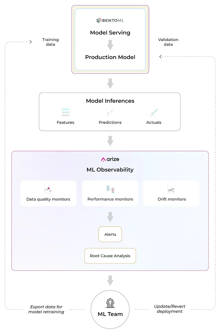 BentoML and Arize AI have partnered to streamline the MLOps toolchain and help teams build, ship, and maintain business-critical models. Leverage Bentoโs ML service platform to easily turn ML models into production-worthy prediction services. Once your model is in production, use Arizeโs ML observability platform to attain the necessary visibility to keep your model in production.