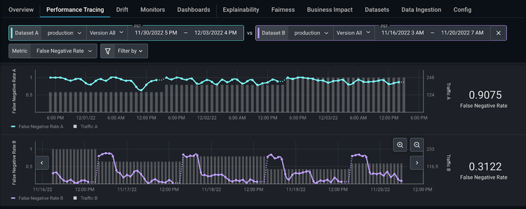 When your model deviates from the threshold, use the performance tracing tab to troubleshoot the features and slices that affect our model the most.