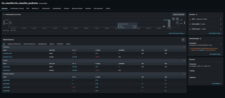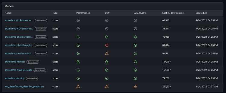 If you havenโt yet, get started using Arize for free here! Once we log on to the platform, we can see our iris_classifier:iris_classifier_prediction model on the โModelsโ page.