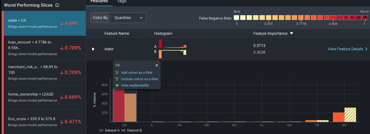 From here, Arize automatically surfaces the slices that affect your model performance the most on the โPerformance Insightsโ card. Click on state = CA to compare how this slice behaves differently between the two datasets.